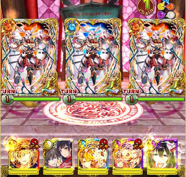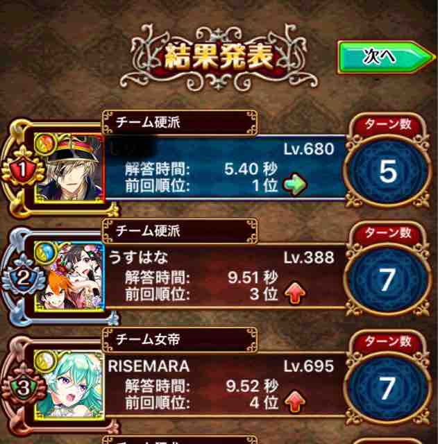 新人王ミルド、ミライ、プティ、ヴィタ、ヴァイオレッタ(3問解答)で回ってます。亀のパク…です。ミルドが20%以下にならなかったり、ミルドの九死が発動しなかったりという事もあるようですが、自分はまだ遭遇してません。